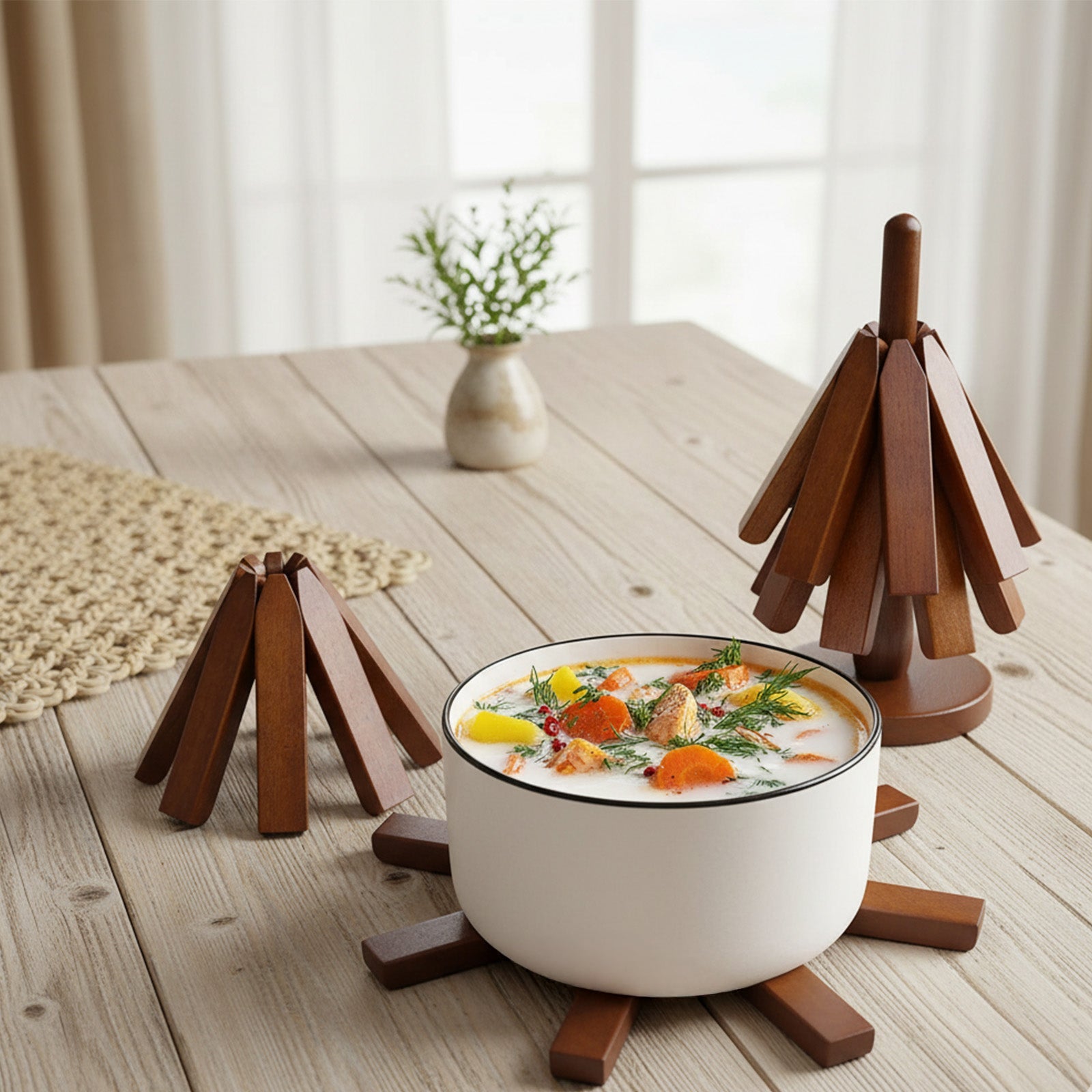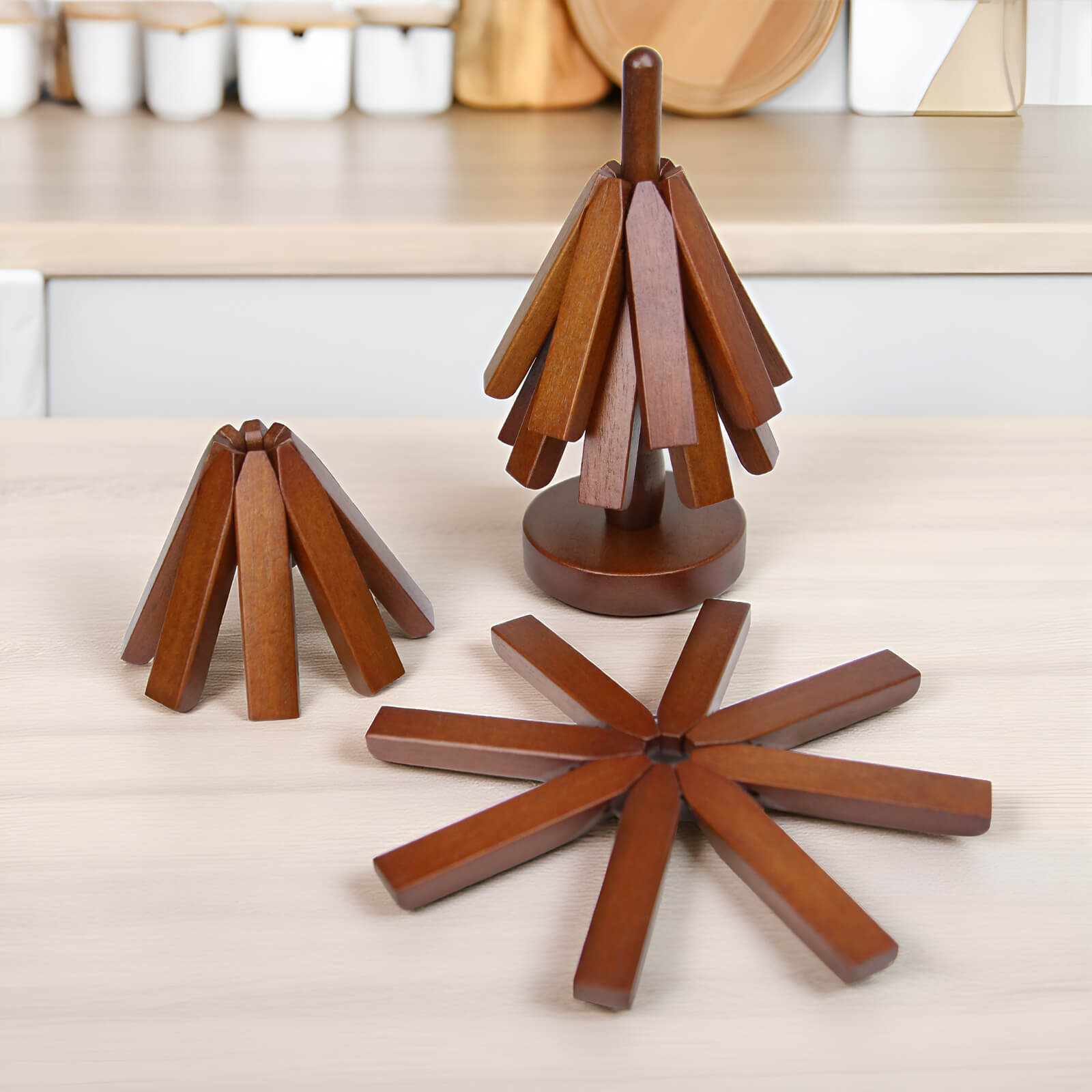 Each coaster consists of eight small wooden pieces connected by an elastic cord, allowing it to quickly return to its original shape when not in use. Simply take one coaster from the holder, place it on the table, and carefully set your pot or dish on top – no preparation needed.